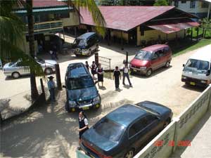 Cars picking up students students after school. Picture taken from the balcony of the main building looking across the small street (Loorweg) that divides the school's two properties. |